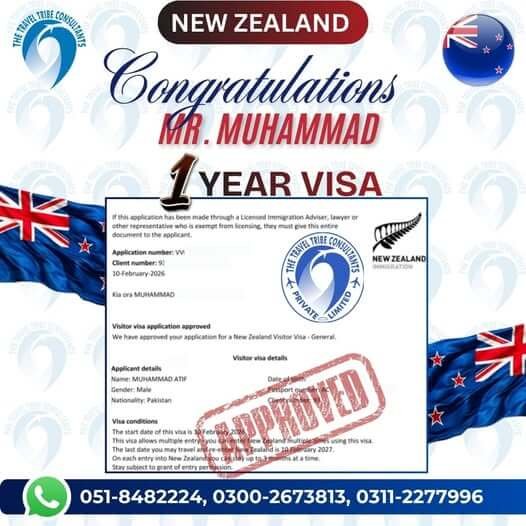 Congratulations! Mr. Muhammad on approval of 01 YEAR MULTIPLE New Zealand Visit Visa & Thank you for trusting The Travel Tribe Consultants with your journey — your dream of exploring New Zealand’s breathtaking landscapes is now one step closer.